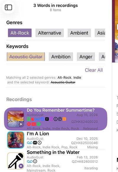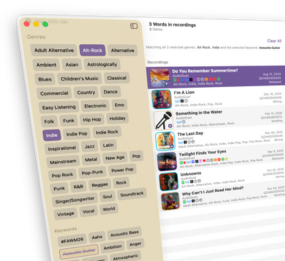 Over time, your catalog transforms into something you can query from multiple angles — by mood, instrumentation, theme, genre, or creative intent.
